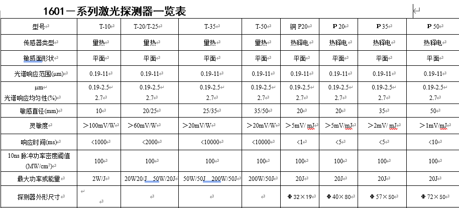 最高功率密度為200W/cm2 ;測量脈沖能量時,探測器能承受單次脈沖幅射峰值功率密度為100MW/cm2 超過此閾值會導致探測器的損壞。